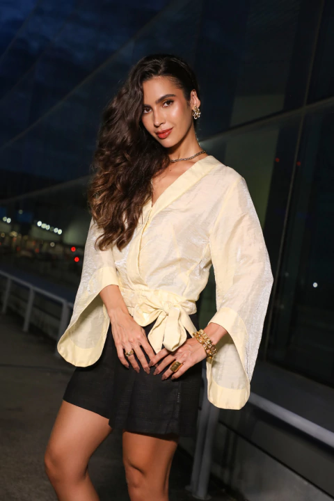 Modelagem mais reta contando com o charme do decote e assimetria das mangas. A blusa Lírio é transpassada com fechos de pressão e amarração lateral.