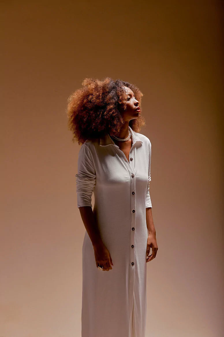 Com um formato simples e caimento reto, nossa chemise é para todas as estações, é feita de malha vicenza de viscose com acabamento texturizado. Possui mangas longas, gola de camisa com uma tênue estrutura, uma fenda frontal e botões de madeira com leves rajadas.